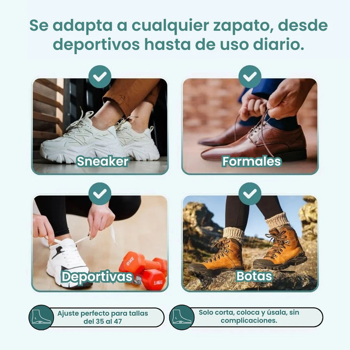 Su diseño ergonómico permite que las plantillas se adapten a la forma natural de tu pie, garantizando un ajuste cómodo y sin presión dentro de tus zapatos.